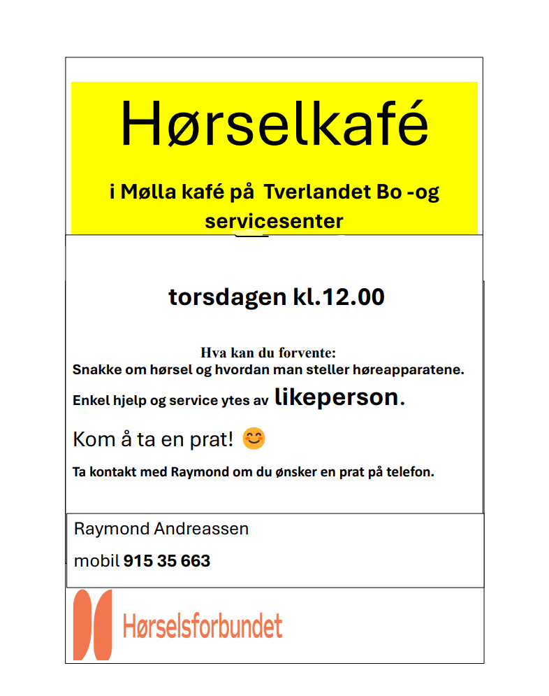 På torsdager i oddetallsuker arrangeres hørselkafé i Mølla kafé på Tverlandet bo og servicesenter. Vi starter opp 28.august.Aldersgruppe: For alle